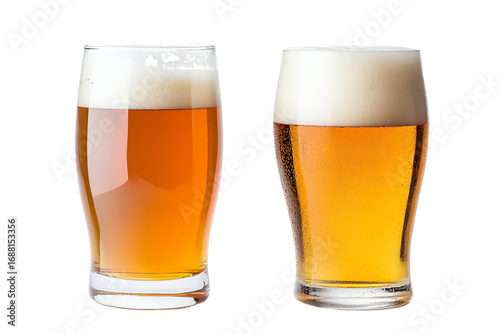 Two glasses of beer, one amber and one golden, on a white isolated background. Refreshing beverages with frothy tops.