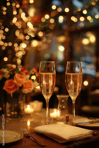 Two glasses of champagne sparkling on a table for a romantic dinner