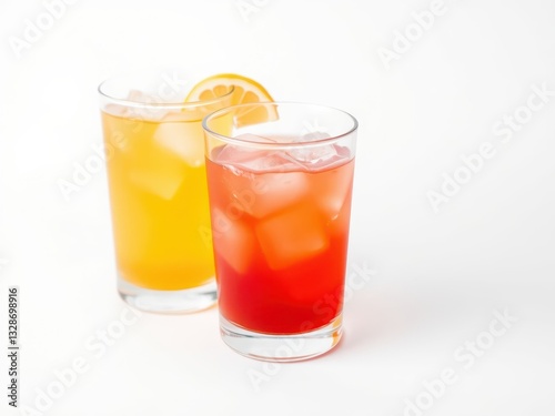 lemon slice, orange juice, ice cube, refreshing, beverage, cocktail, cold, drink, yellow, red, orange, studio shot, white background, copy space, 1, 2, food, drink, summer, refreshment, citrous, fruit, ice, glasses, studio, still life, nobody, indoor, day