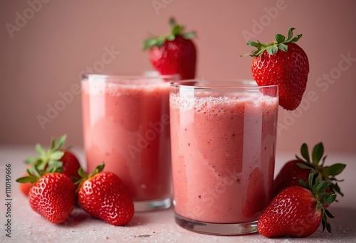 Two glasses of strawberry smoothie or juice with fresh strawberries on the rim and around the glasses