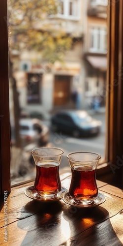 two glasses of Turkish tea resting on a table, their amber color glowing in the soft sunlight streaming through the window.