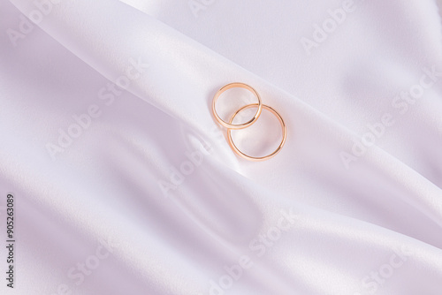 Two gold classic wedding rings on a white background of satin fabric with soft pleats. top view. A copy space. wedding layout. for the design