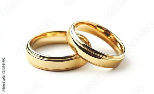 Two gold wedding bands resting on a white background. They display a simple, elegant design, featuring a smooth, rounded interior and a subtly beveled exterior