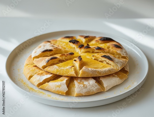 Two golden baked flatbreads on a white plate with a light background food photography image