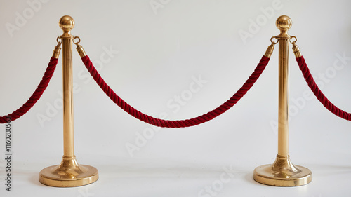 Two Golden Ornate Pillars with Red Velvet Rope, Curved Barrier, Golden Spherical Knobs, Elegant Design, White Background Highlighting Luxurious Gold and Red Elements, Classic Decorative Entrance Setup