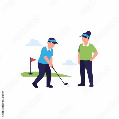 golf, golfer, swing, club, sport, player, course, green, flag, man, woman, standing, preparing, observing, leisure, activity, game, competition, summer, casual attire, sporting, equipment, red, blue, light, simple, illustration, cartoon, flat, design, character, people, relaxation
