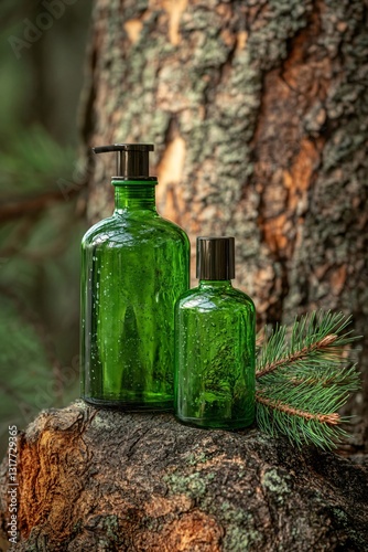 Two green vials are displayed on the log . The vials are located next to each other, and the log is surrounded by moss. Concept of nature and tranquility