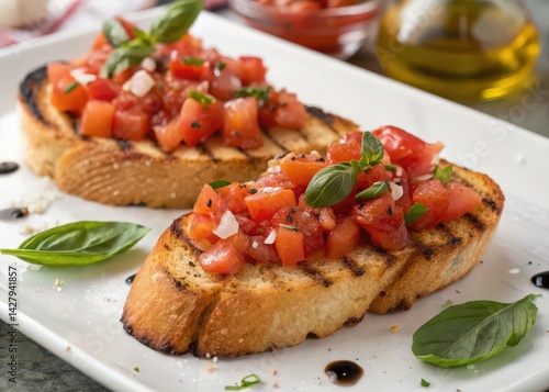 Two grilled bread slices topped with tomato sauce, basil, and olive oil on white plate.