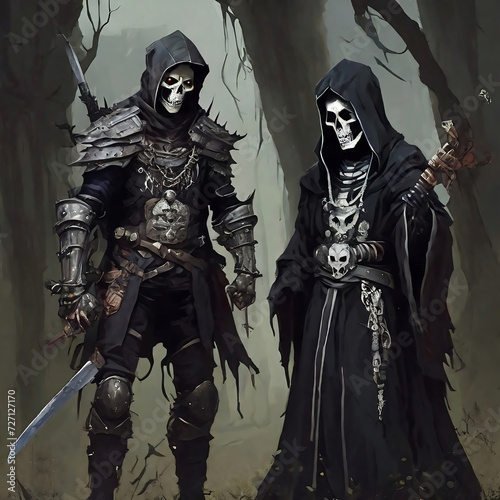 Two grim reaper with swords in the foggy dark forest. Halloween theme