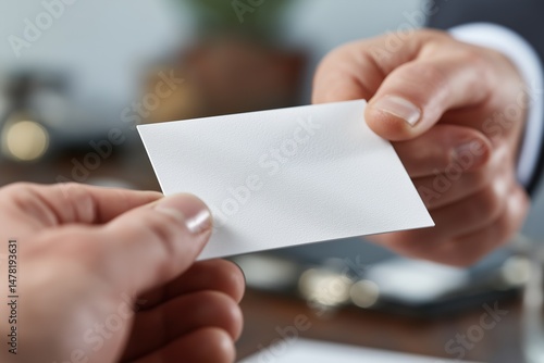 Two hands exchanging a blank business card in a professional setting, symbolizing networking, communication, and opportunities in business relationships and connections