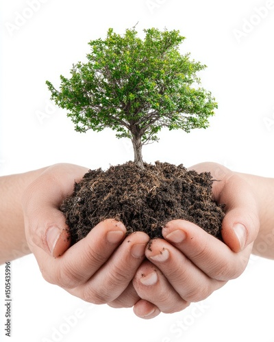 Two hands gently cradle a small, lush green tree nestled in dark soil against a stark white background, symbolizing growth and care