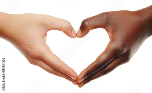 Two hands of different skin tones forming a heart shape on a white background, symbolizing love and unity.