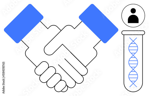 Two hands shaking, symbolizing collaboration, next to a DNA strand in a test tube and a user profile. Ideal for partnership, science, genetics, technology, teamwork, innovation simple flat metaphor