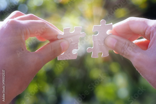 Two hands try to connect puzzle pieces, coupled with a natural bokeh background. Jigsaw puzzle only with sunlight. Part of all Association symbols and connections Business strategy.
