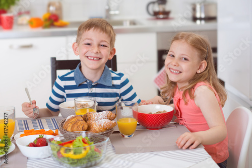 Two happy children having breakfast in kitchen