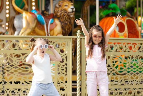 Two happy little girls friends have fun in the amusement park at summer. Happy childhood concept.