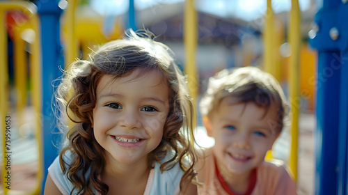two happy mixed race children playing on the playground. Kids having fun in the park. Siblings playing together. Kid's playground in a plublic park. Entertainment and recreation