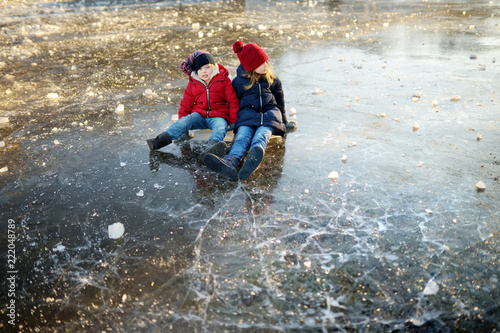 Two happy sisters playing with ice blocks by frozen river during an ice break. Children having fun in winter.