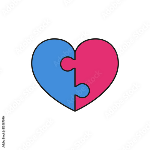 Two heart shaped puzzle pieces joined together. Vector illustration in outline and line style.