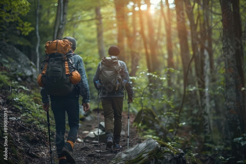 Two hikers with backpacks walk through a lush green forest trail. The sun shines through the trees in the background.