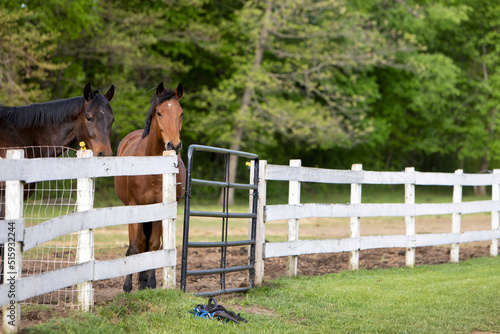 horse, 2, horse farm, equine, fence, animal, farm, green, pasture, rural, ranch, gate, pair, domestic, tree, summer
