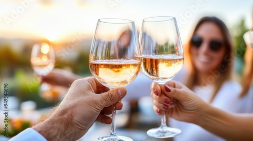 Two individuals are raising and clinking their wine glasses filled with white wine in an outdoor setting while the sun sets in the background, celebrating together.