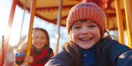 Two joyful children are captured candidly while enjoying a merry-go-round ride, encapsulating the essence of childhood happiness and carefree play.