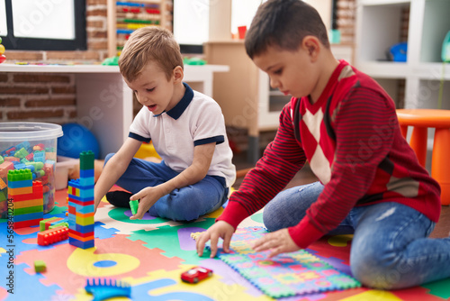 Two kids playing with construction blocks and maths puzzle game sitting on floor at kindergarten