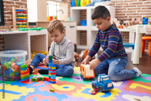 Two kids playing with construction blocks and truck toy sitting on floor at kindergarten