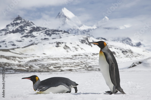 Two king penguins, one sliding on its belly, cross a snowfield in front of the majest peaks of South Georgia Island