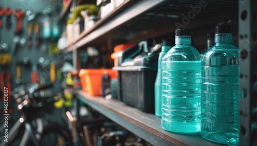 Two Large Plastic Bottles of Blue Liquid on a Garage Shelf