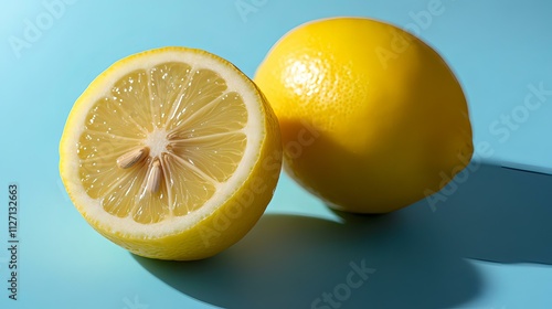 lemon, fruit, citrous, yellow, food, photo, still, life, bright, juicy, fresh, ripe, summer, healthy, vitamin, acidic, zesty, tart, refreshing, delicious, nature, organic, diet, nourishment, vegan, vegetarian, colours, vibrant, background, blue, studio, shot, closeup, macro, object, image, composition, cut, half, whole