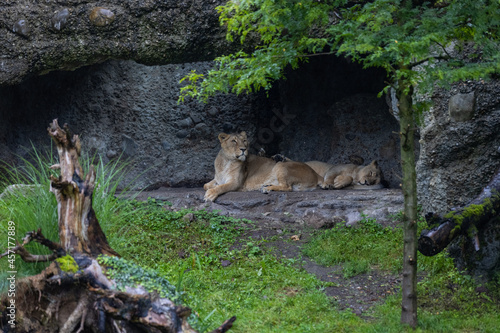 Two lions are sleeping and watching the viewers and waiting for their food. Amazing pair of lion just relaxing in the savanna. Majestic animal in the nature.