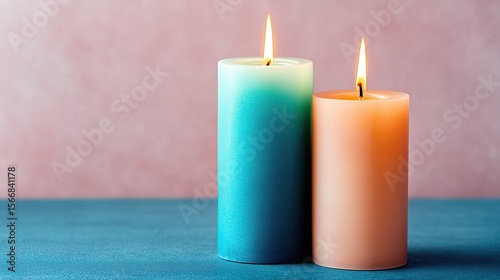 Two lit candles: gradient blue and warm beige on blue table against pink wall