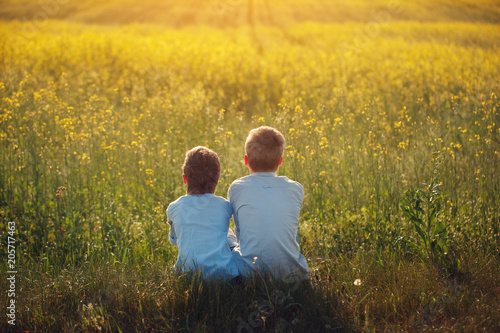 Two little boys friends hug each other on sunset summer. Brother love. Concept friendship. Rear view.