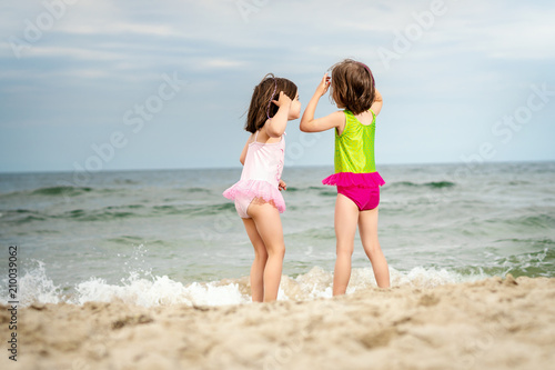 two little girls sisters are standing and playing on the sand at the beach on a summer day