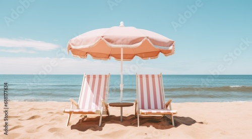 two lounge chairs on the beach with an umbrella,