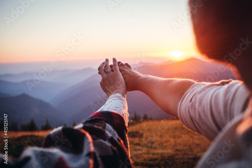 atmosphere, hand, sunset, together, finger, romance, mountain, summer, love, touch, happy, sunrise, arm, magic, girl, beautiful, female, adventure, outdoors, glare, sunlight, 2, closeup