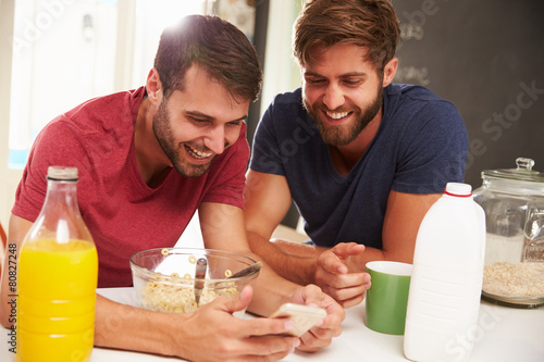 Two Male Friends Having Breakfast And Reading Text Message