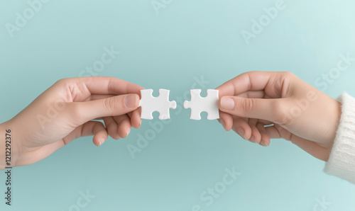 Two male hands in white shirts connecting puzzle pieces, representing collaboration and teamwork. The jigsaw pieces are set against a vibrant blue background, creating a clean and professional visual