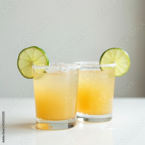 Two margarita cocktails on white. Fresh lime slices, salt rimmed glasses. Refreshing Mexican drink, perfect for party, bar menu, summer season. Alcoholic beverage with ice.
