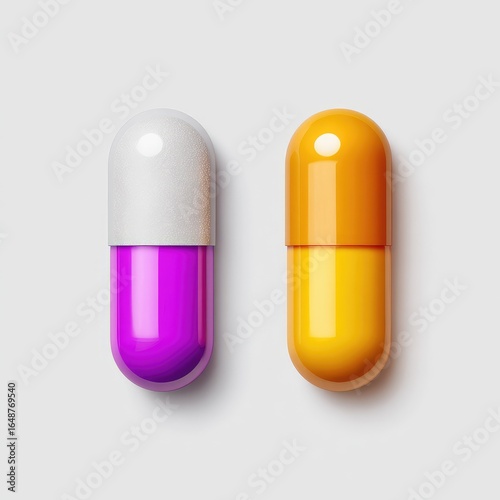 capsule, medicine, pill, drug, health, pharmacy, treatment, medication, pharmaceutical, chemist's shop, medicals, therapy, health care, vitamin, supplement, orange, yellow, purple, pink, white, shiny, bright, isolated, three-dimensional, realistic, topview, graphic, illustration, design, digital, rendering, modern, care, prevention, make well, relief, aid, promoting