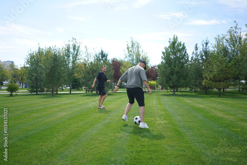 soccer, pass, ball, 2, man, park, grass, tree, sunny, afternoon, friendly, match, recreation, athletic, kicking, teamwork, sport, leisure, exercise, summer, vibrant, field, nature, competition, player, game, fun, activity, movement, fitness, youth, enjoyable, play, skill, action, strategy, casual attire, energetic, rolling, sprinting, coordination, turf, goal, sportsmanship