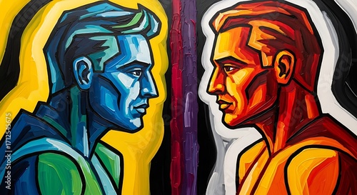 man, portrait, colours, art, face, opposite, direction, bold, contrast, colourful, drawing, painting, figure, human, male, profile, visual, image, modern, contemporary, abstract, expressionism, expressionist, style, design, illustration, creative, artist, artwork, colours