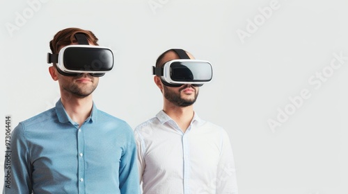 Two men in casual shirts wearing virtual reality headsets, standing side by side, immersed in a virtual experience against a plain background.
