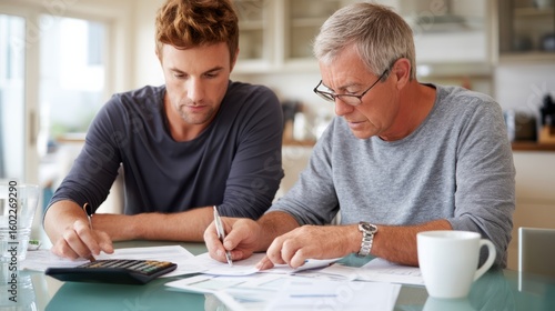 man, adult, senior, male, people, home, kitchen, table, paperwork, calculating machine, pen, hot drink, cup, goggles, casual attire, discussion, planning, budget, finance, indoor, lifestyle, focused, teamwork, document, writing