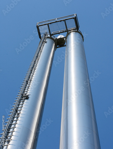 pipe, pipe, chimney, metal, platform, iron, aluminium, ladder, up, sky, clear, high, blue, view, production, water, electricity, ecology