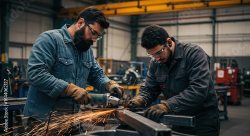 factory, men at work, grinding, metal, spark, teamwork, metalworking, industrial, workshop, collaboration, fabrication, manufacturing, manual labor, safety, protection, steel, industry, colleague, craftsman, men at work, blue-collar, concentration, focused, job, profession, equipment, machinery, production, construction, apprentice, mentor, partnership, precision