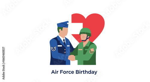 Two military personnel shaking hands, a heart symbol, celebrating Air Force Birthday.