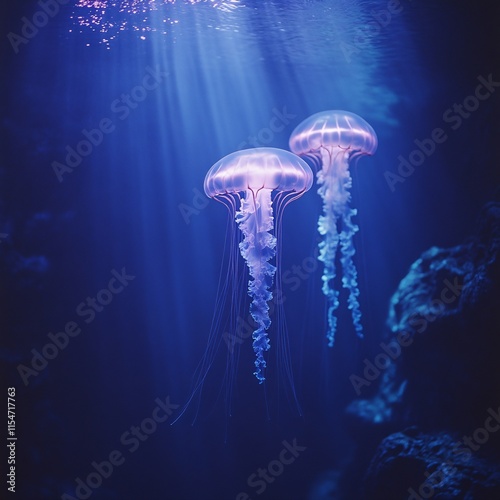 2, minimalist, jellyfish, floating, together, ancient, glowing, ocean